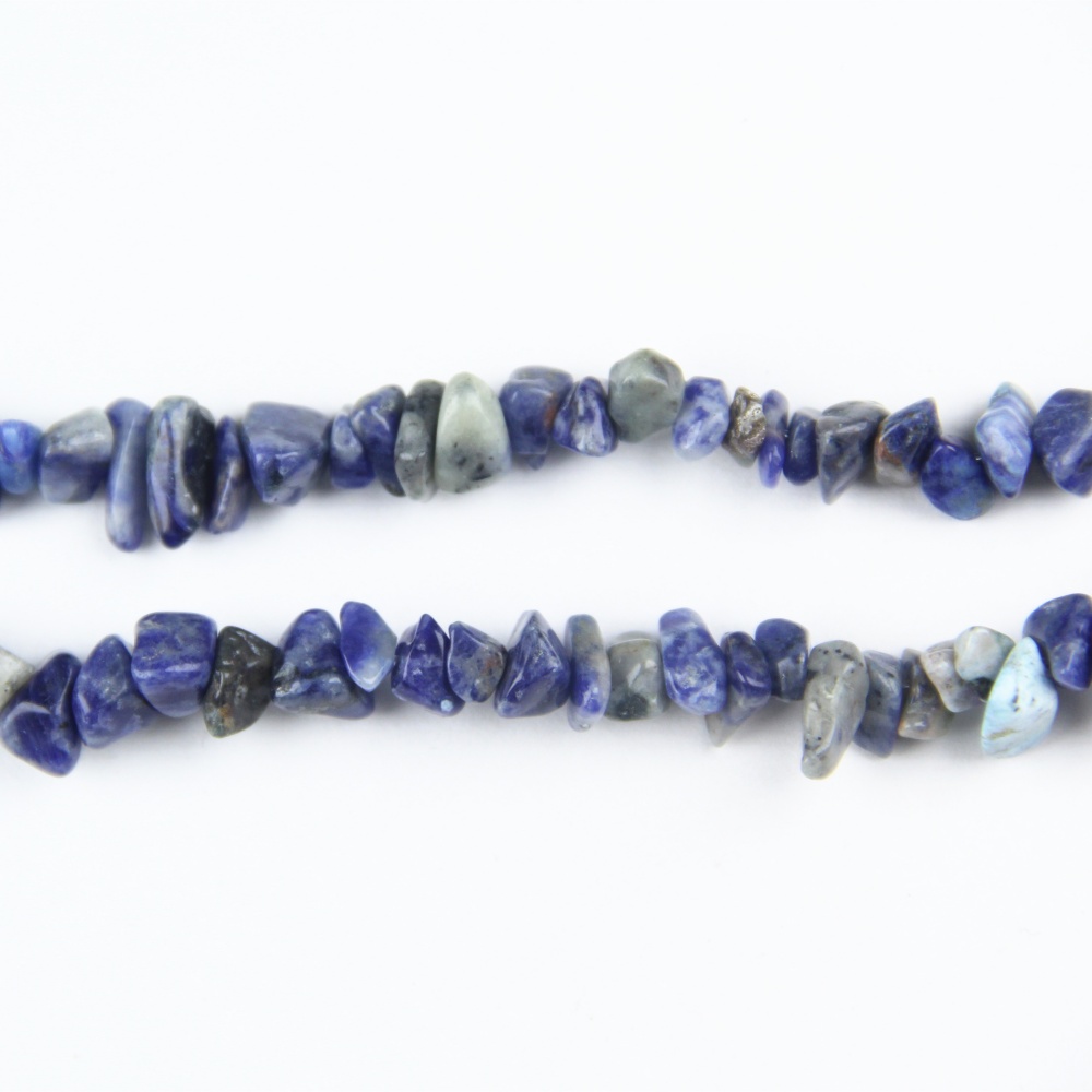 Long 31.5-inch strand of raw, uncut sodalite chip beads in vivid blue. High stock availability for fast wholesale shipping and custom gemstone orders.