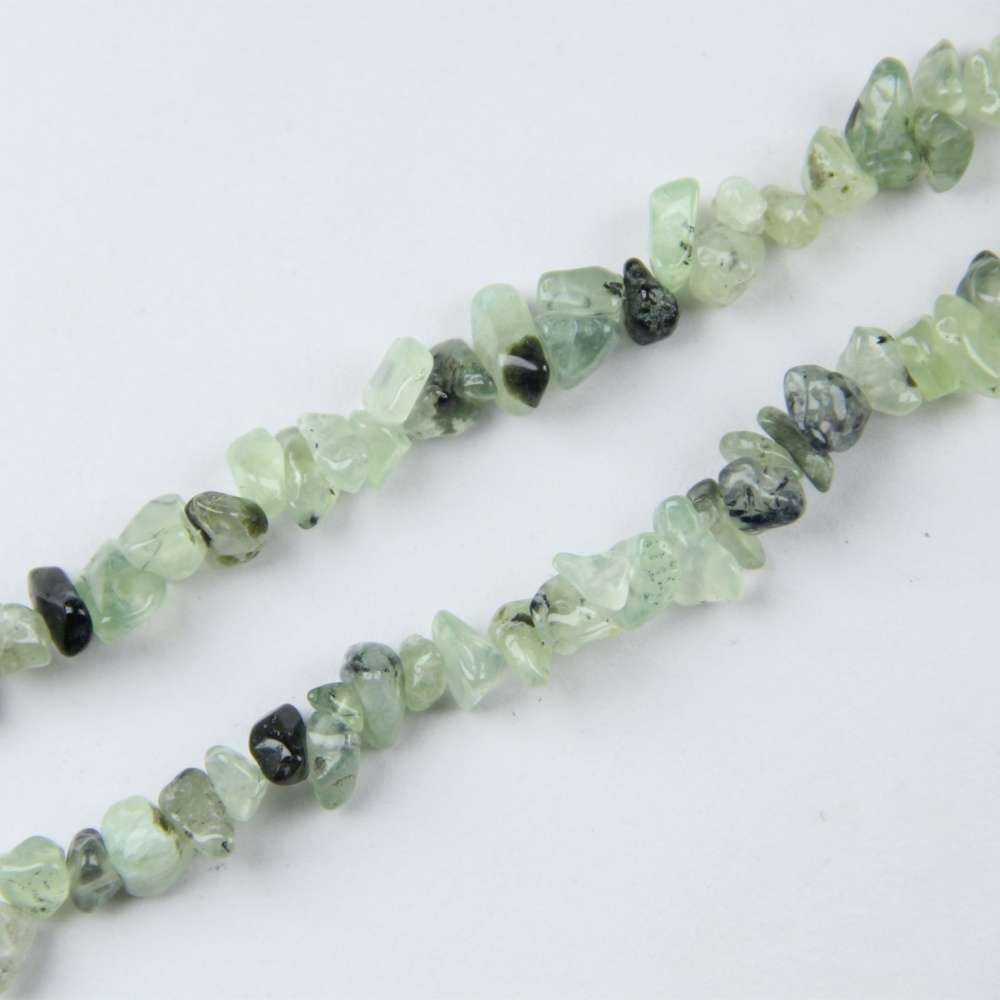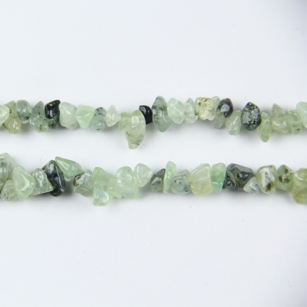 Prehnite chip beads, also called Prehnite nuggets or Prehnite chips, feature small, irregular pebble shapes. Designers love their organic look in boho and healing jewelry.