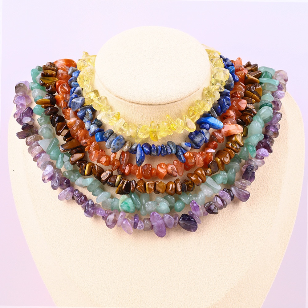 Depending on your design needs, we can include stones such as amethyst chip necklace, lapis chip necklace, moonstone chip necklace, or aquamarine chip necklace in the mix. Each stone brings its own color and symbolic meaning, which makes the necklace suitable for both fashion jewelry and chakra healing collections.